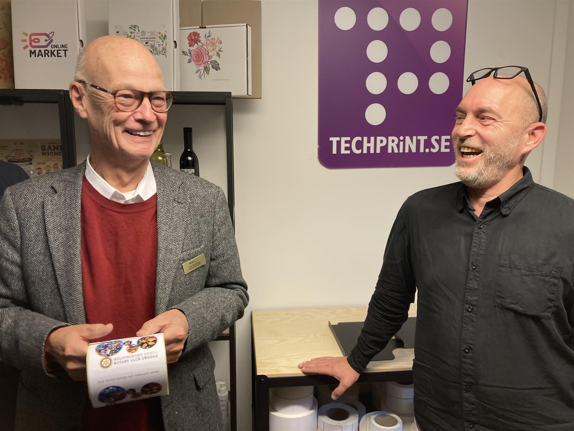 Som demo tryckte de stora etiketter med Rotary Bergas logotype som vi fick med oss som present. Ett mycket intressant föredrag som vi var 12 medlemmar som besökte.